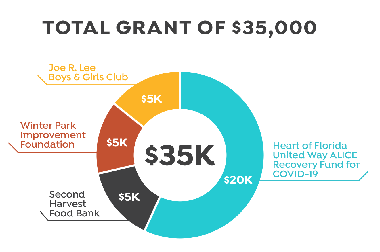 The organizations set to receive the grants are the Heart of Florida United Way ALICE Recovery Fund for COVID-19, Joe R. Lee Boys & Girls Club in Eatonville, Second Harvest Food Bank, and the Winter Park Improvement Foundation. The largest portion of funding, $20,000, was distributed to the Heart of Florida United Way ALICE Recovery Fund for COVID-19. The ALICE Recovery Fund provides support for rent, mortgage, and utility costs to “asset-limited, income-restrained, employed” individuals who have been impacted financially due to COVID-19. Support will be focused in Eatonville, Maitland, and Winter Park.