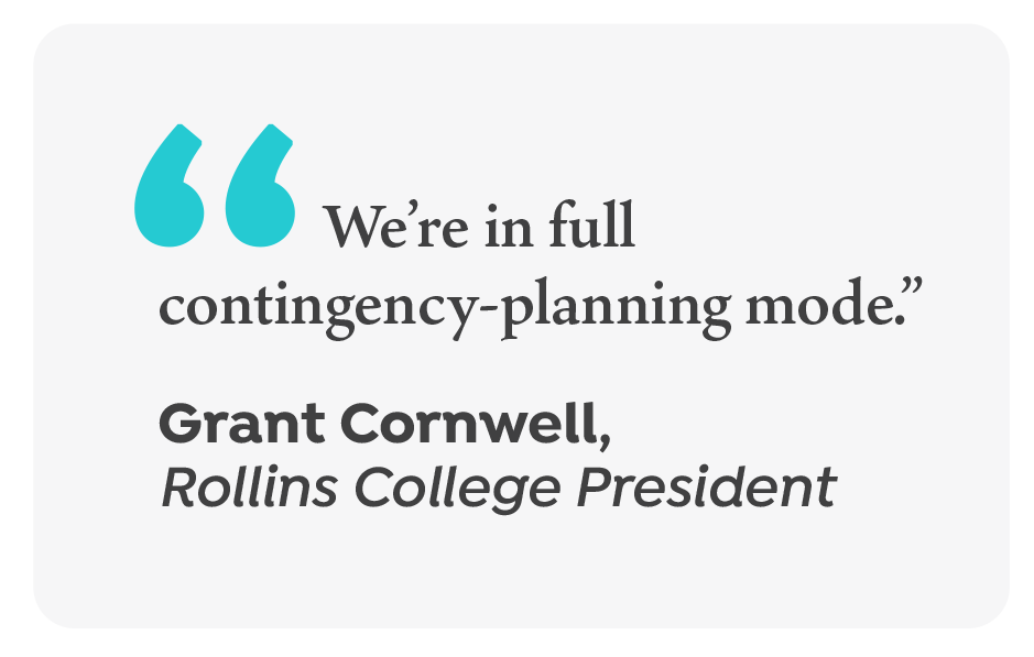 Recognizing the financial pressures students and their families are facing, Rollins is analyzing the potential financial impact of a declining enrollment, which may prove especially challenging if the campus is not able to open in time for the start of the Fall semester. “We’re in full contingency planning mode,” Cornwell said. “Students are saying to us in large numbers, ‘if Rollins is online, we’re going to take a time out.’ That’s a tremendous risk for the college.”
