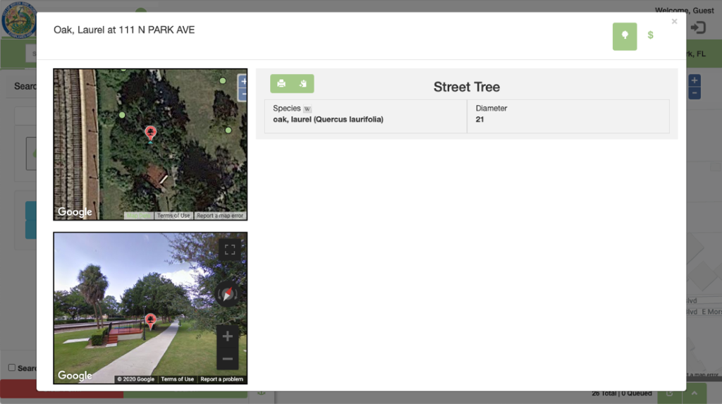 Residents and visitors can use TreeKeeper to take a walking tour of Central Park in downtown Winter Park and learn about the trees in the area. The software identifies the locations of various trees within the park, guiding users through their tour. Clicking on a tree on the interactive map brings up details about its size and species, as well as aerial and street views of its location. One tree (below) at 111 N. Park Ave., for example, is noted to be a laurel oak that spans 21 feet.