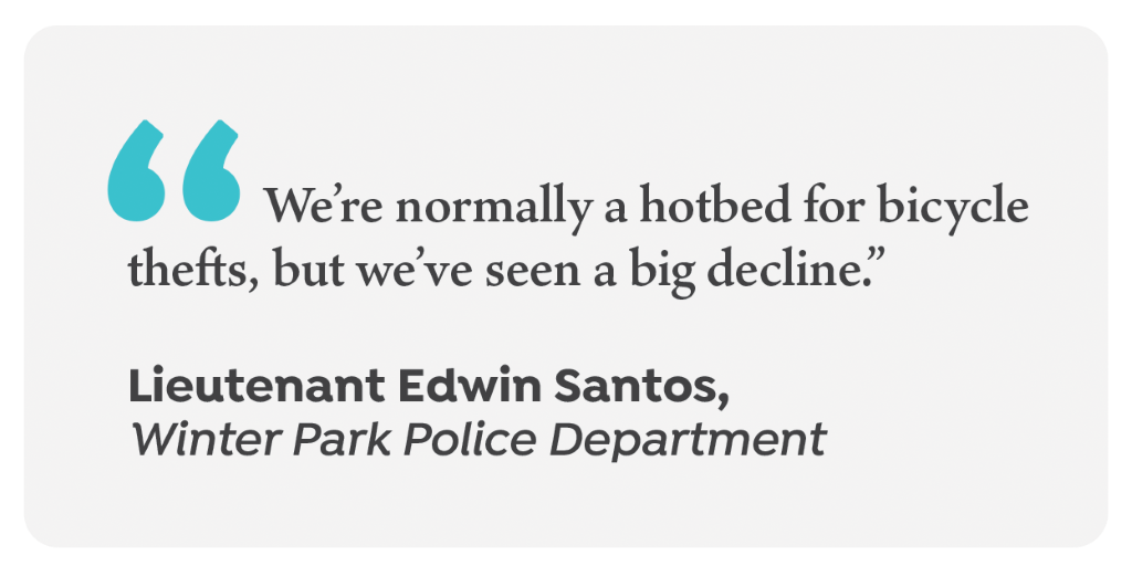 “We’re normally a hotbed for bicycle thefts, but we’ve seen a big decline,” Santos said. Although the decrease in thefts is noticeable, the department is reminding citizens to stay vigilant and secure bicycles in racks. “People think it’s Winter Park and it’s secure. They use our racks but don’t lock them. Winter Park is targeted [for bicycle theft],” Santos explained.