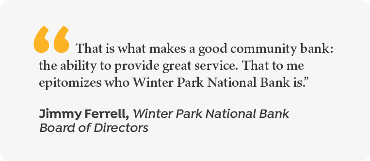 Of course, attaining the proper certification and taking on a large group of new clients in such a small period required a team dedicated to supporting the financial needs of the community. “The board of Winter Park National Bank is very proud of how management and the employees assisted with the PPP program,” said Jimmy Ferrell, a founding member of the bank’s Board of Directors. “We had many employees that were working weekends and overtime to help with these loans. I am very proud of how we responded in a proactive way to get things done. That is what makes a good community bank: the ability to provide great service. That, to me, epitomizes who Winter Park National Bank is.”
