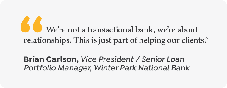 After observing how difficult it was for many local businesses to secure loan money, bank leadership recognized that there was going to be many local businesses seeking out institutions to help them survive this difficult economic period and Winter Park National Bank immediately began the process of becoming a Small Business Administration (SBA) certified lender. The bank referred its clients in need of immediate assistance to partner companies until they were approved in time for the second wave of PPP funding.