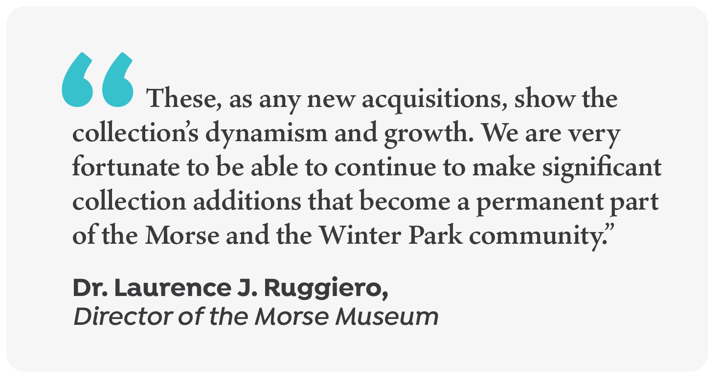 “Tiffany’s magnificent fireplace hood and the Alice Gouvy designs … add even more depth to the Museum’s holdings,” said Dr. Laurence J. Ruggiero, Director of the Morse Museum. “These, as any new acquisitions, show the collection’s dynamism and growth. We are very fortunate to be able to continue to make significant collection additions that become a permanent part of the Morse and the Winter Park community.”