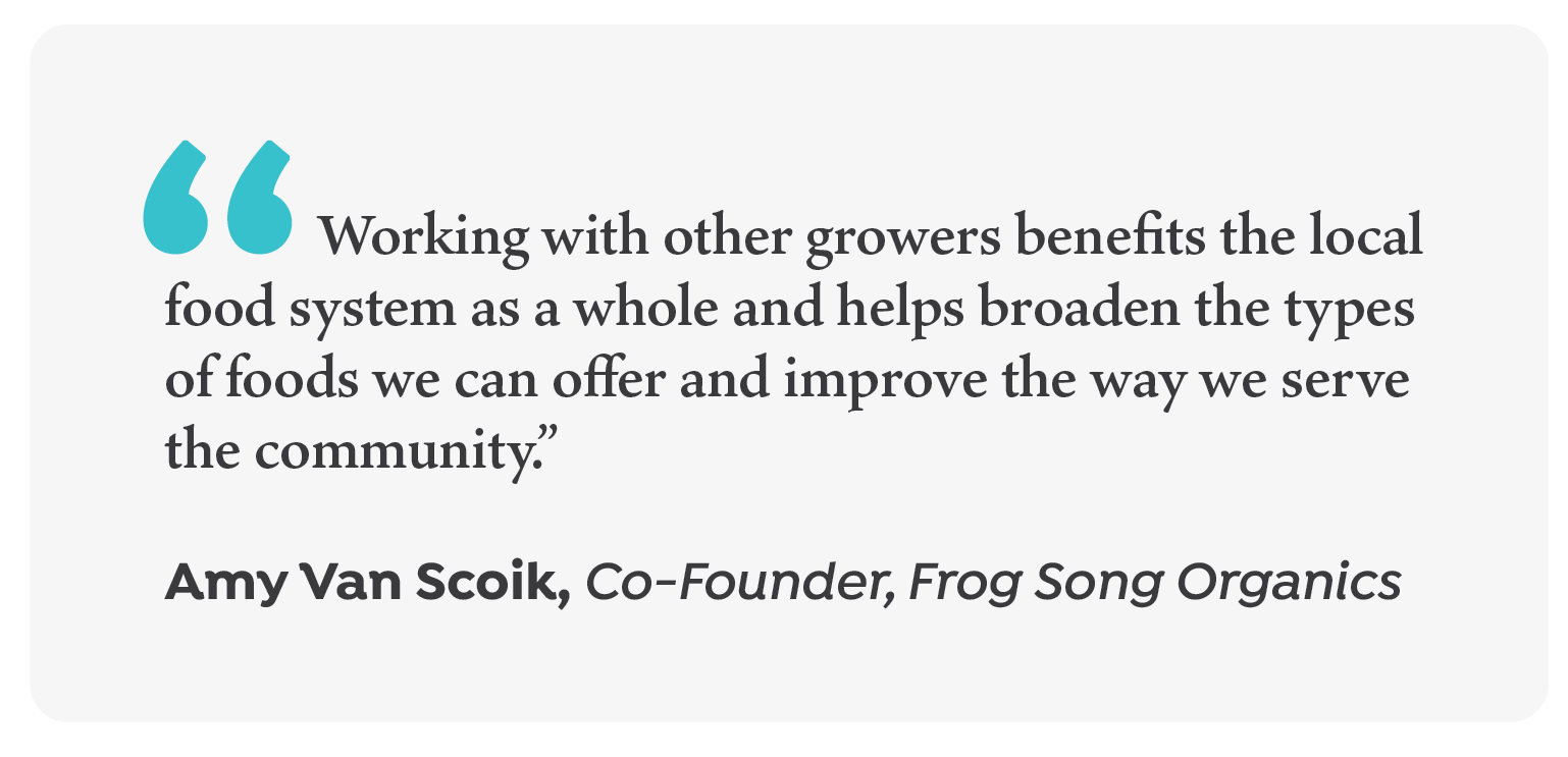 Van Scoik also shared her and her husband’s passion for supporting not only their own business, but the entire local food system. Frog Song Organics partners with numerous local farms by buying and reselling their products. By purchasing from other smaller, independent farms, Frog Song Organics is able to help other businesses like their own get established and continue to grow. “Working with other growers benefits the local food system as a whole and helps broaden the types of foods we can offer and improve the way we serve the community,” Van Scoik said.