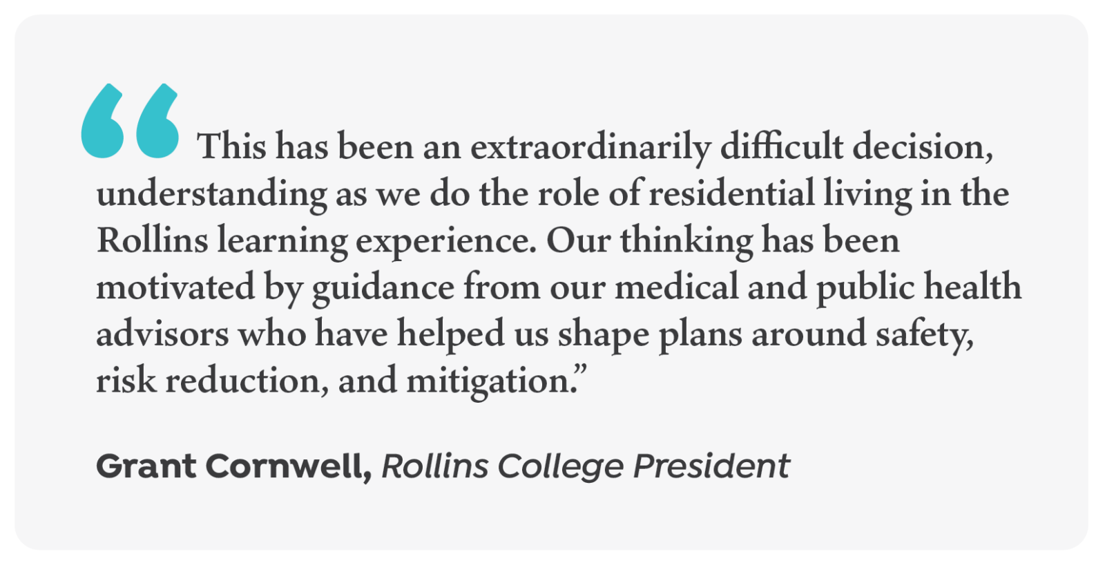 “This has been an extraordinarily difficult decision, understanding as we do the role of residential living in the Rollins learning experience,” Cornwell said. “Our thinking has been motivated by guidance from our medical and public health advisors who have helped us shape plans around safety, risk reduction, and mitigation.”