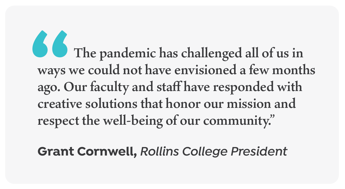“The pandemic has challenged all of us in ways we could not have envisioned a few months ago,” Cornwell said at the conclusion of his statement. “Our faculty and staff have responded with creative solutions that honor our mission and respect the well-being of our community. The goal of our plan to reduce residential density on campus translates to a reduction of risk and exposure for the health and safety of the entire Rollins community.”