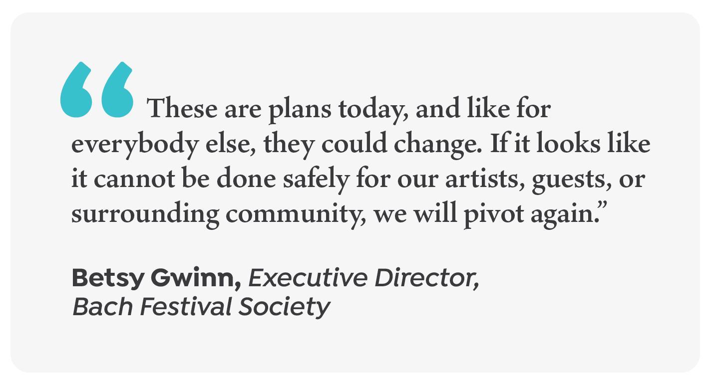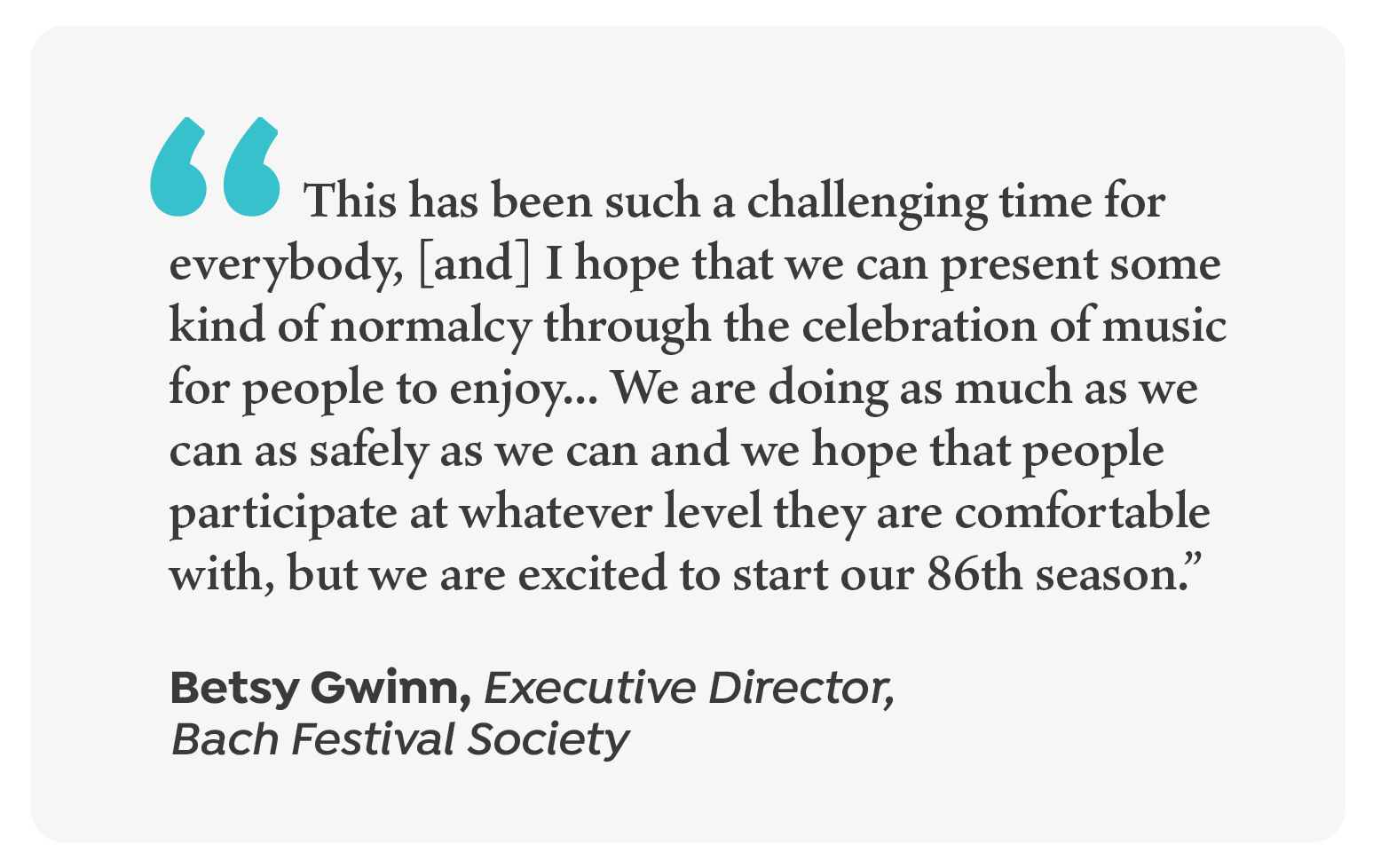 The Bach Festival Society plans to allow attendees to choose between viewing this season’s events in person or virtually. While the organization hopes this setup will allow patrons the option to safely attend the live events, planned to be held in Tiedtke Concert Hall at Rollins College, Executive Director Betsy Gwinn recognizes that the situation is fluid. “These are plans today, and like for everybody else, they could change,” Gwinn said. “If it looks like it cannot be done safely for our artists, guests or surrounding community, we will pivot again.”