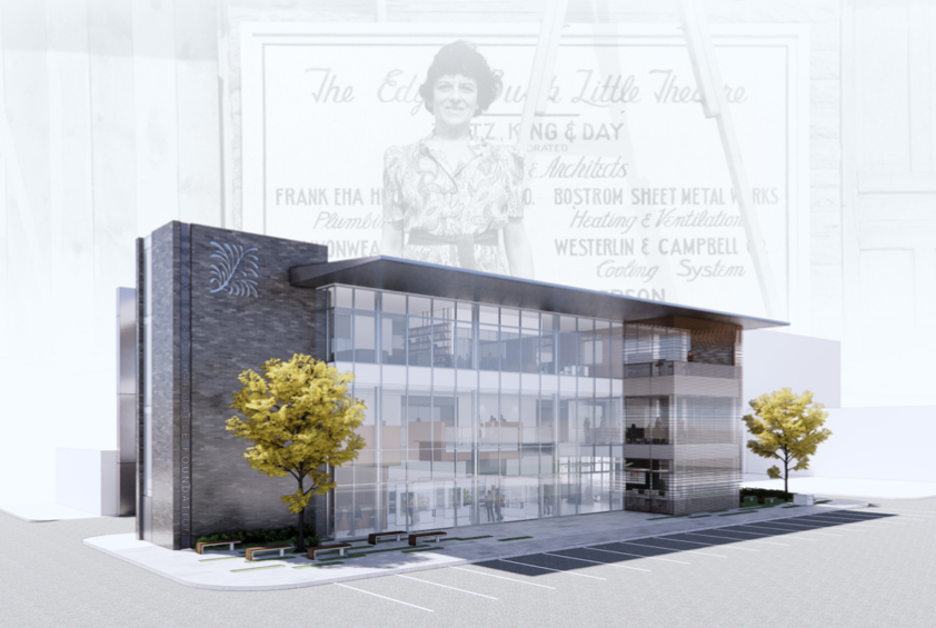A rendering of “The Edyth” building, designed by SchenkelShultz Architecture, overlaid on an image of Edyth Bush. Image courtesy of: Edyth Bush Charitable Foundation