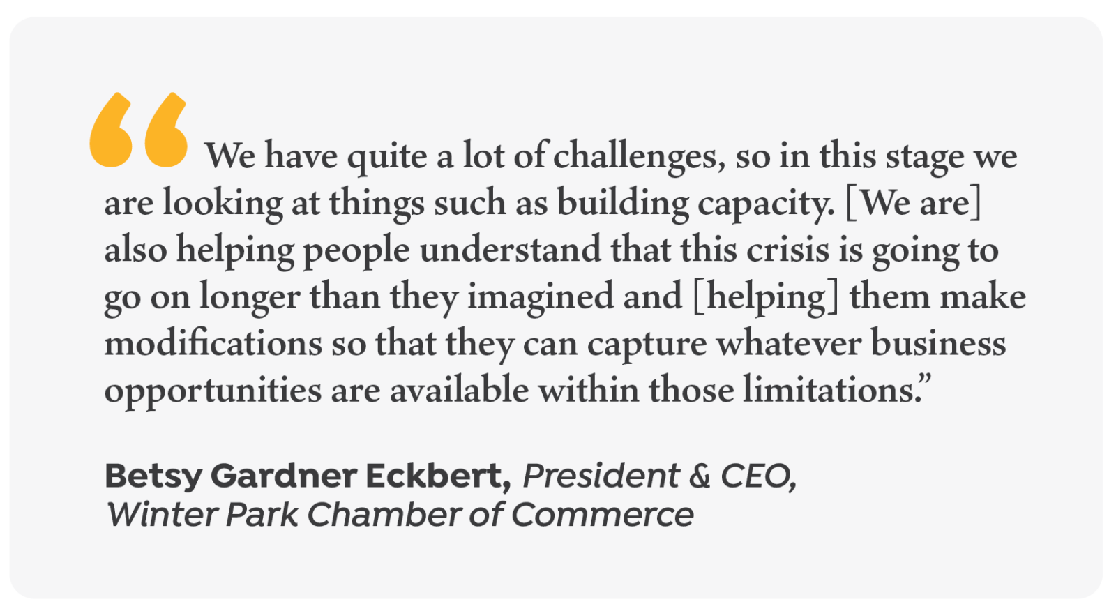 “We have quite a lot of challenges, so in this stage we are looking at things such as building capacity. [We are] also helping people understand that this crisis is going to go on longer than they imagined and [helping] them make modifications so that they can capture whatever business opportunities are available within those limitations,” said Betsy Gardner Eckbert, president and CEO of the Winter Park Chamber of Commerce.