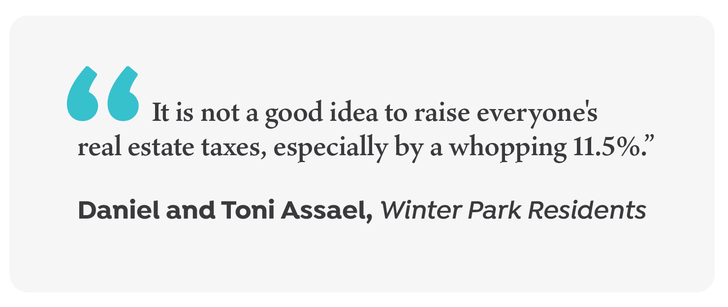 In a recent email to the city commissioners, Winter Park Residents Daniel and Toni Assael urged the commission to give thoughtful consideration to the situation, rather than a knee-jerk reaction, saying “It is not a good idea to raise everyone’s real estate taxes, especially by a whopping 11.5%. It will punish everyone in Winter Park, especially, our many neighbors who, through no fault of their own, have lost their jobs, their businesses and their livelihoods.”