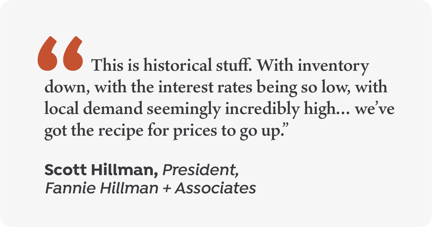 Hillman sees the low inventory, low interest rates, and high demand as the perfect opportunity for sellers to raise their price points. “This is historical stuff. With inventory down, with the interest rates being so low, [and] with local demand seemingly incredibly high… We’ve got the recipe for prices to go up,” said Hillman.