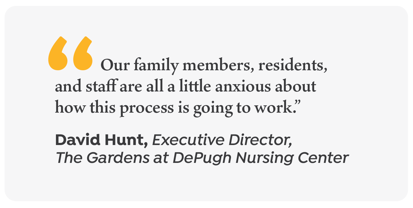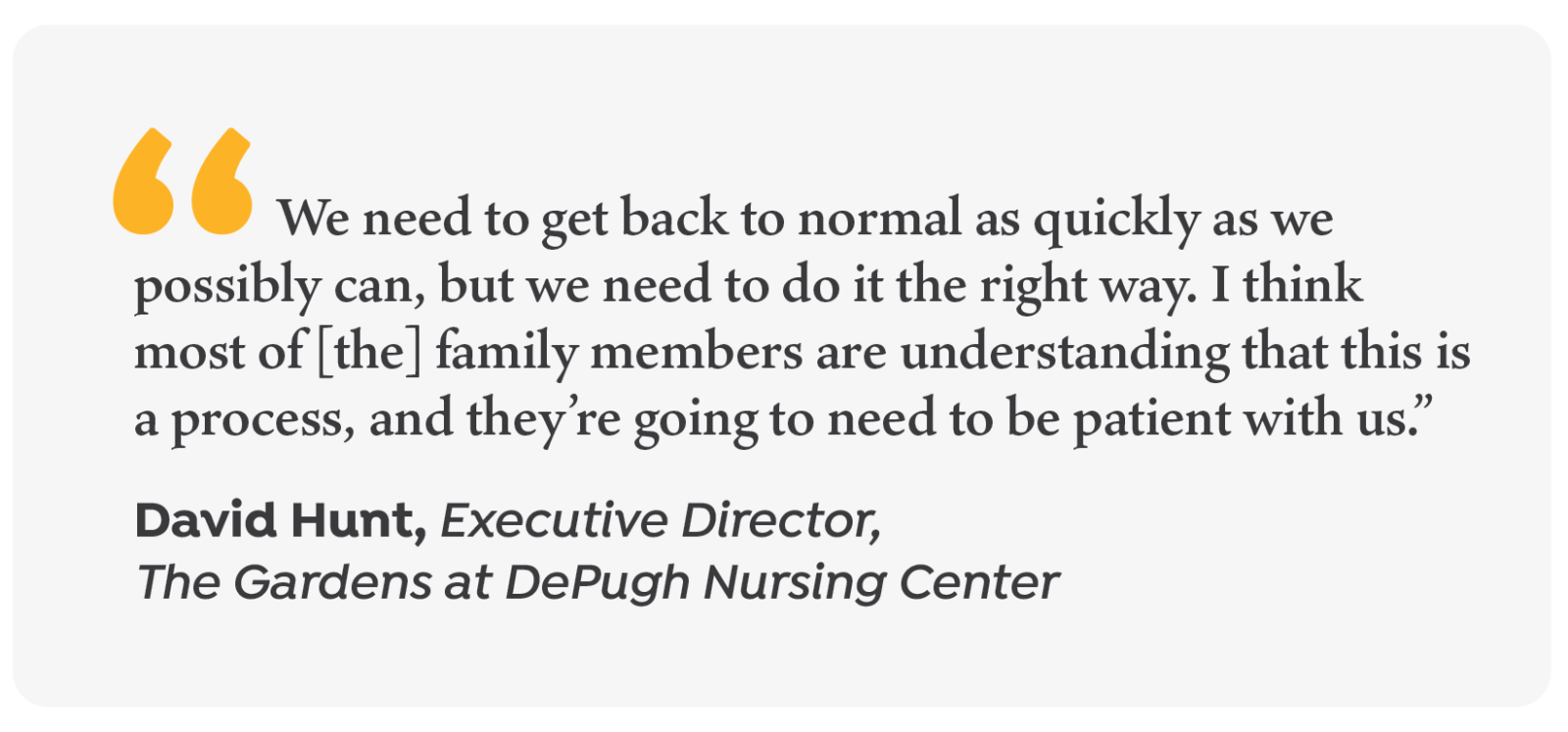 When the pandemic hit, Florida Governor Ron DeSantis restricted visitation at all nursing homes for the safety of their elderly residents. DeSantis lifted the imposed ban on September 1, following recommendations from a nursing home task force that met weeks prior. The staff at The Gardens at DePugh Nursing Center had developed their reopening plan weeks in advance, anticipating the lift of the ban and ensuring they could allow visitors as soon as possible. “We saw our first visitor—the first family member to see their loved one—on September 11,” said David Hunt, executive director of The Gardens at DePugh Nursing Center.
