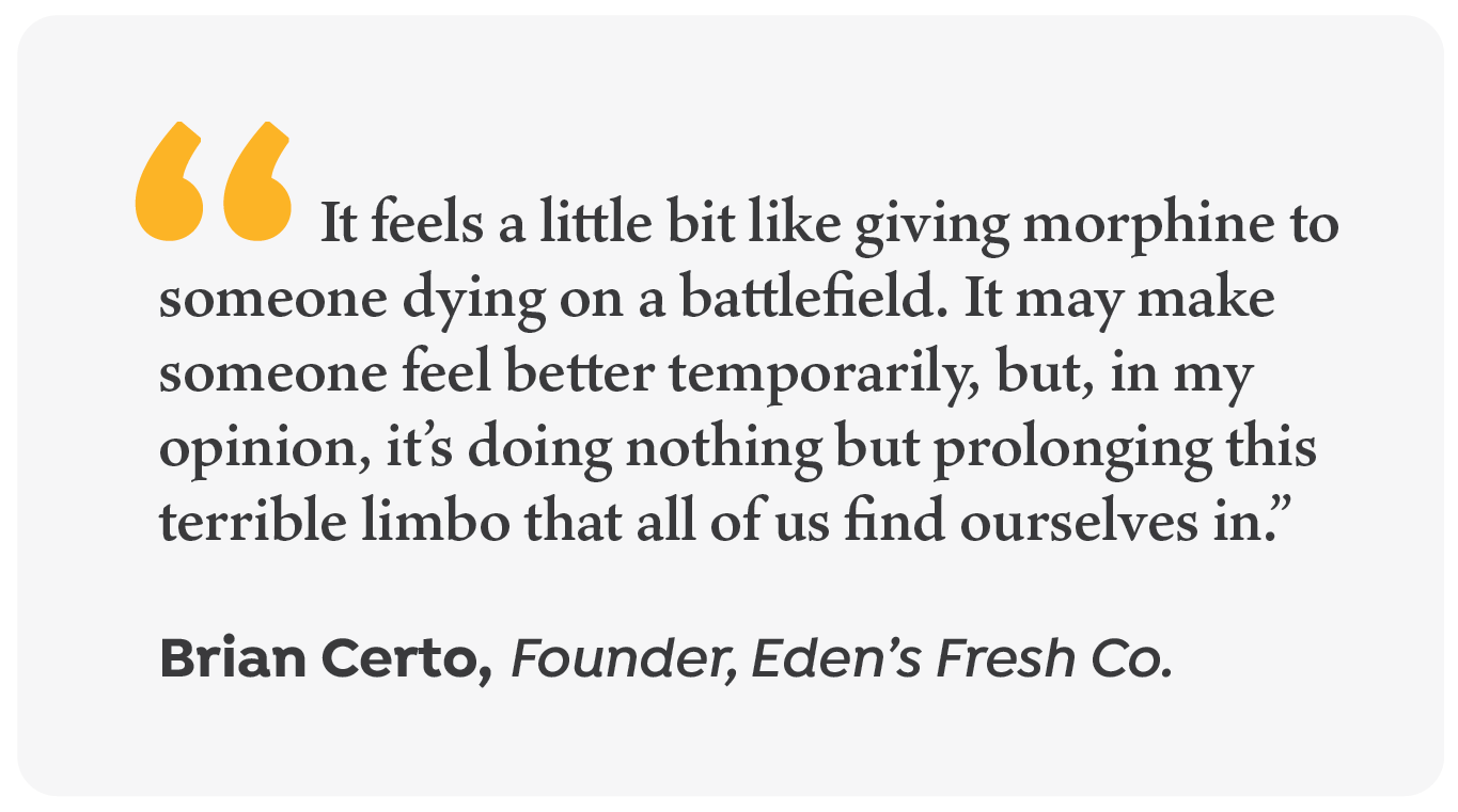 While Certo sympathizes with restaurant concepts that rely heavily on filling their dining rooms to turn a profit, he is not convinced that the increased capacity will solve the problem. “It feels a little bit like giving morphine to someone dying on a battlefield,” he said. “It may make someone feel better temporarily, but, in my opinion, it’s doing nothing but prolonging this terrible limbo that all of us find ourselves in.”