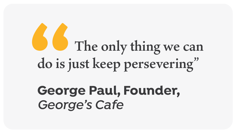 Voted one of the top three caterers in Central Florida, George’s Cafe relied on catering for 60 percent of its business prior to COVID-19, but with cancellations of large gatherings, the restaurant has taken an enormous hit.With catering only now starting to slowly pick back up, Paul is turning to other means to try and keep his restaurant in business. For example, George’s Cafe opened for breakfast four days a week in October and will be doing takeout orders with fullycooked turkeys for Thanksgiving and opening for large private parties in the evenings.