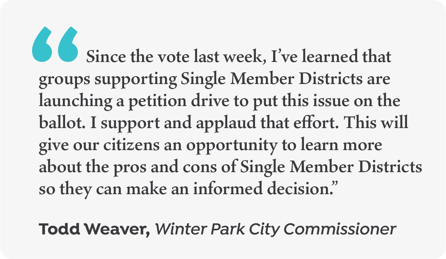 “Since the vote last week, I’ve learned that groups supporting Single Member Districts are launching a petition drive to put this issue on the ballot,” Weaver said in his letter. “I support and applaud that effort. This will give our citizens an opportunity to learn more about the pros and cons of Single Member Districts so they can make an informed decision.”