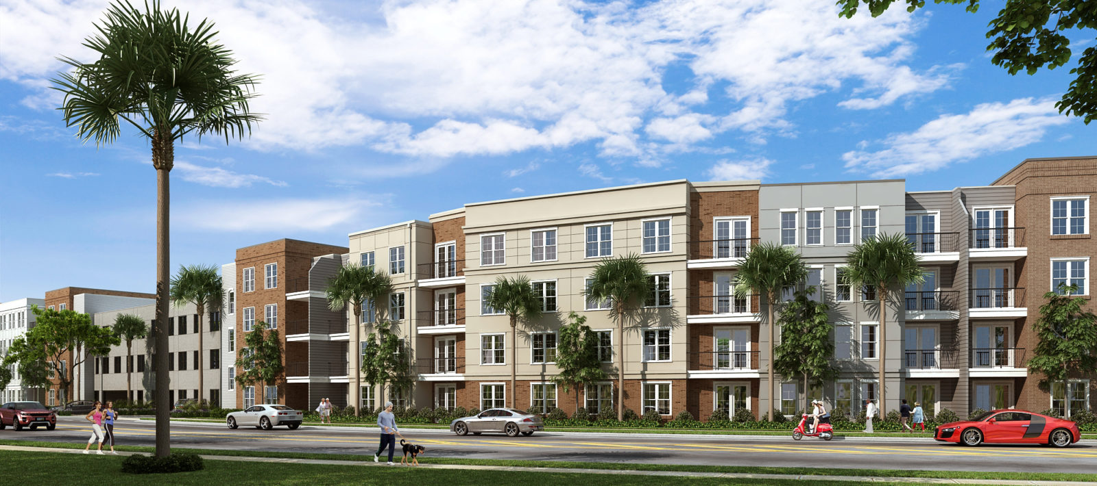 An exterior rendering of the proposed Silver Hills at Universal apartment project in Orlando, one of Dimit Architects’ Florida projects. Image Courtesy of: Dimit Architects