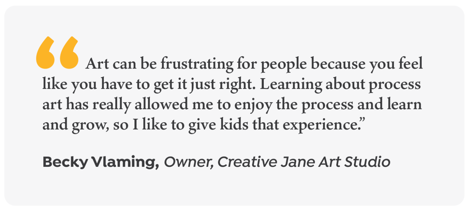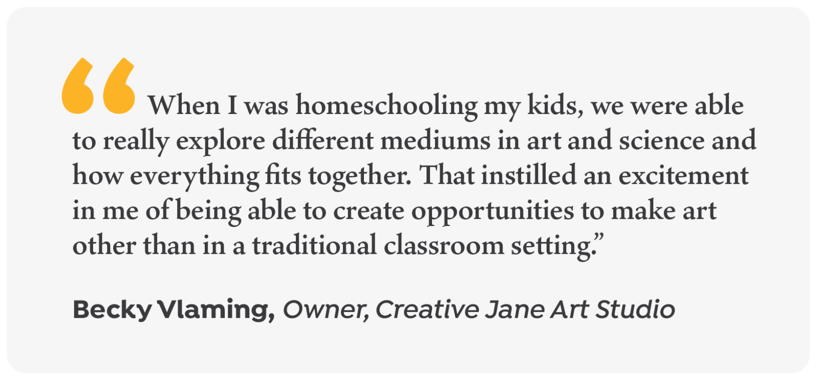 After graduating from Western Michigan University with an art education degree and starting a family, Vlaming and her husband decided to homeschool their two children. It was then that Vlaming, for the very first time, began to explore art in a classroom setting, something in which she’d long had an interest. “When I was homeschooling my kids, we were able to really explore different mediums in art and science and how everything fits together,” Vlaming said. “That instilled an excitement in me of being able to create opportunities to make art other than in a traditional classroom setting.”