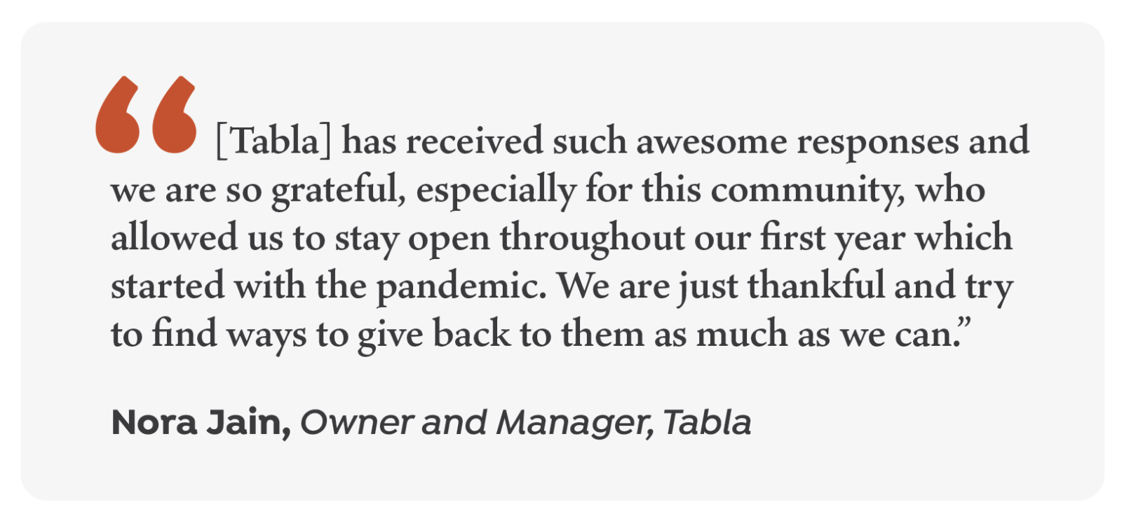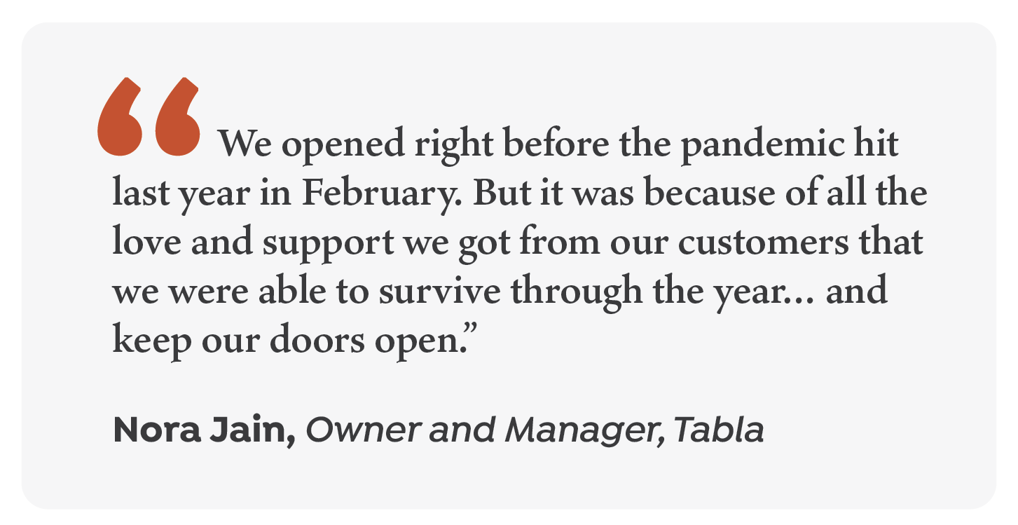 “[Tabla] has received such awesome responses and we are so grateful, especially for [those in] this community, who allowed us to stay open throughout our first year which started with the pandemic,” Jain said. “We are just thankful and try to find ways to give back to them as much as we can.”