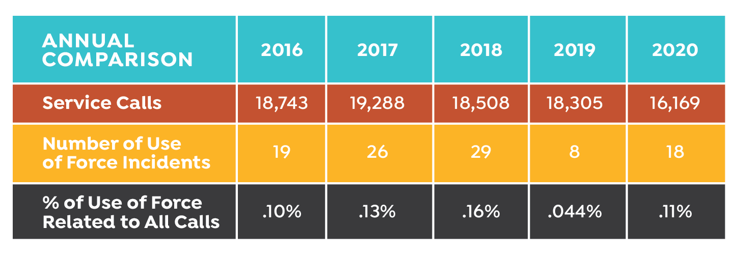 The numbers in 2020 remained consistent, relative to the last four years. 2019 saw a slight decrease in use-of-force incidents, but across time, they made up between 0.10% and 0.15% of the departments total number of service calls.