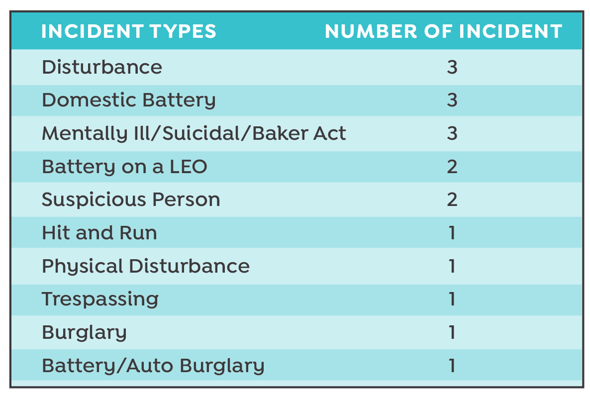 The department analyzed the original calls for service that resulted in an officer using force on a person. Those calls included disturbance, domestic battery, mentally ill/suicidal/Baker Act, battery on a law enforcement officer, suspicious person, hit and run, physical disturbance, trespassing, burglary and battery/auto burglary.