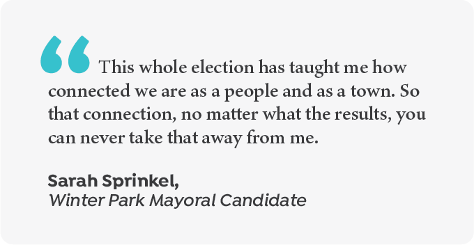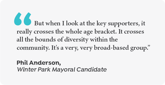 Anderson shares Sprinkel’s sentiment and feels he’s been enriched by his journey on the campaign trail. From his talk with a resident who has called Winter Park home for over 90 years to discussing issues with students at Rollins College and Winter Park High School, he’s grateful running for mayor has helped him discover how much common ground, charm, and character exist in Winter Park communities.
