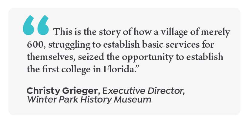 Founded in 1885, Rollins College was introduced just three years after a train depot, the first building dedicated to the City of Winter Park, was established. “The town and the college literally grew up alongside of each other. Their history is intertwined, as together they celebrated milestones and tackled the challenges of citrus freezes, the Great Depression, and wars,” said Christy Grieger, executive director of the Winter Park History Museum. “This is the story of how a village of merely 600, struggling to establish basic services for themselves, seized the opportunity to establish the first college in Florida.”