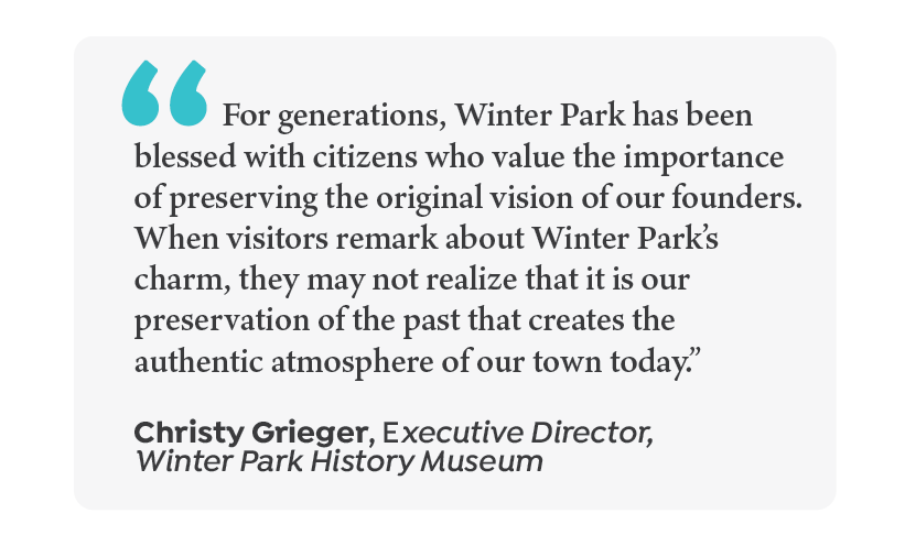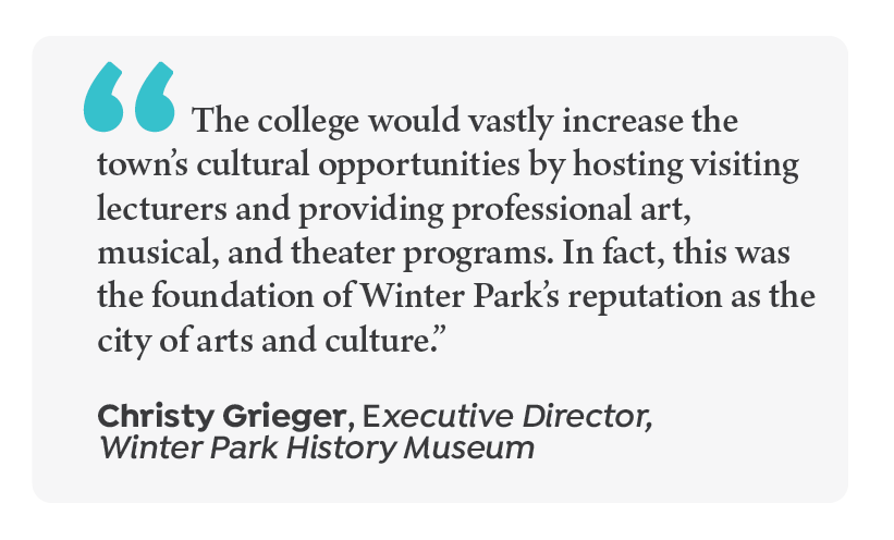 Since the town’s establishment, securing the presence of a college in Winter Park was a priority for both financial and cultural reasons. The Congregational Church worked with the State of Florida in an application process to be selected as the site for the state’s first college. The town was ultimately chosen after Winter Park residents, most of whom were educated at New England colleges, beat out larger cities with funding and land pledges. “A liberal arts college would attract other well-educated settlers ― professors, lecturers, and administrators ― to Winter Park,” Grieger said. “The college would vastly increase the town’s cultural opportunities by hosting visiting lecturers and providing professional art, musical, and theater programs. In fact, this was the foundation of Winter Park’s reputation as the city of arts and culture.”