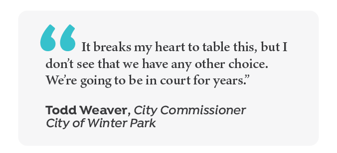 Commissioner Sheila DeCiccio expressed concern with current Orange Avenue property owners already in litigation. While she acknowledged that the OAO likely gives property owners more than it takes away, she felt this new law would encourage their efforts and cost the City hundreds of thousands of dollars in legal fees. “For now, I’m willing to just let this go and work on some things we’ve been wanting to do for the citizens,” DeCiccio said.