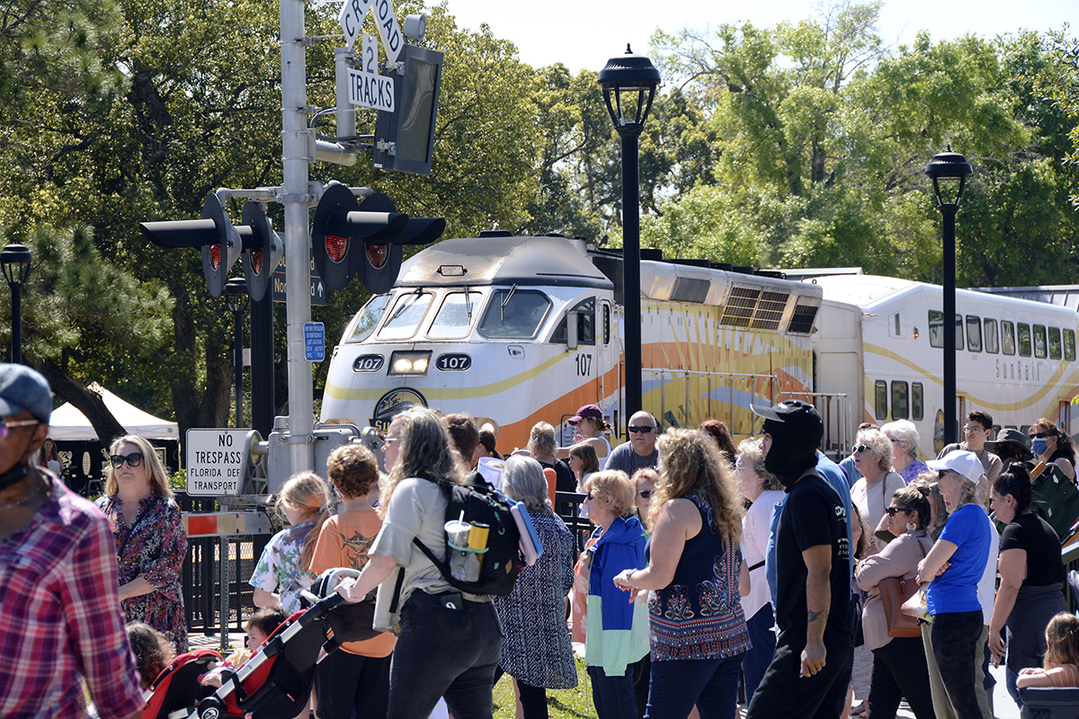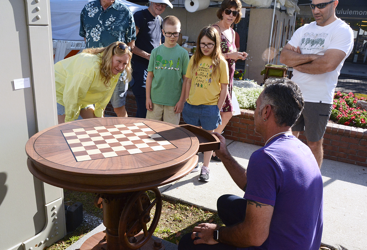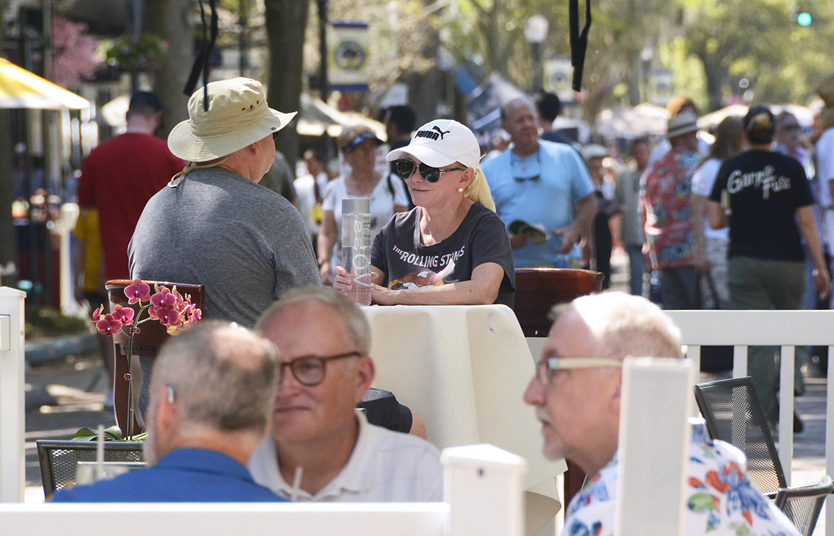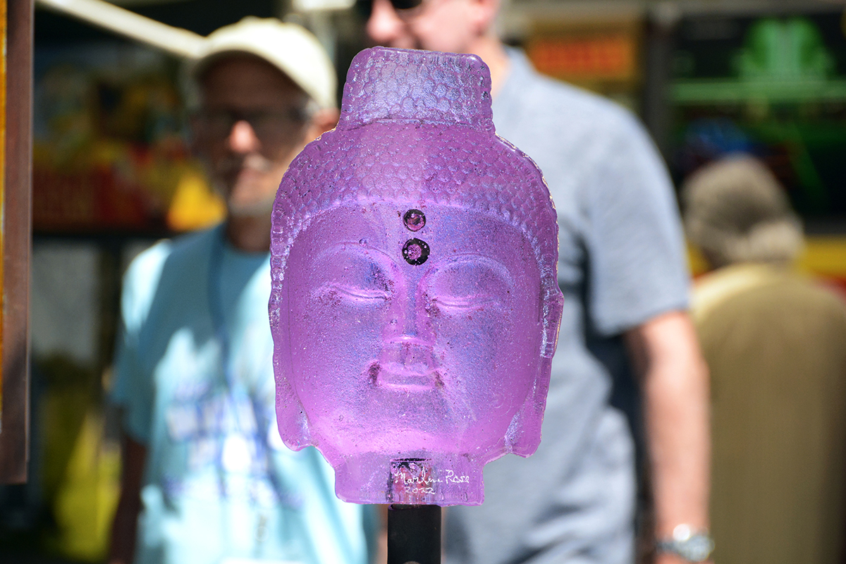 Patrons notice a Buddha sculpture by glass artist Marlene Rose, of Clearwater.Winter Park-based artist John Whipple with some of his mixed-media portraits.James Whipple – brother of John Whipple – arranges his intricate paper collages in his artist booth.The morning sun shines through the glass art of Detroit-based Andrew Madvin.Matthew Naftzger, of Milwaukee, shows off one if his titanium sculptures.Photographer Richard Gayle, of Portland, Maine, exhibited a collection of panoramic scenery.Patrons watch as woodworker James Pearce, of Illinois, shows off a chess table in his exhibit area.Michigan-based artist John Louis Krieger created this “Flying Fish” to honor his uncle, a WW2 pilot.Ella Castino, of Maitland, wears a hat she colored at one of the festival’s children’s workshops.Watercolor artist Vonnie Whitworth, of Virginia Beach, specializes in portraits and realistic scenes..The shops along Park Avenue offer sales and specials during art festival weekend.The springtime weather meant outdoor seating was hard to find at cafés and restaurants.With Park Avenue closed and parking hard to find, SunRail proved very popular for festival goers.Vickie and Terry Bradshaw, of Tennessee, participate in their first WInter Park art festival with their whimsical sculptures of “abandoned” houses, inspired when their children moved out on their own.Lydia Adele Randolph, of Alabama, uses multiple layers and vanishing points to create her colorful landscape paintings.Chris Cumbie, of Mobile, Alabama, combines text and sculpture in his unique art pieces.