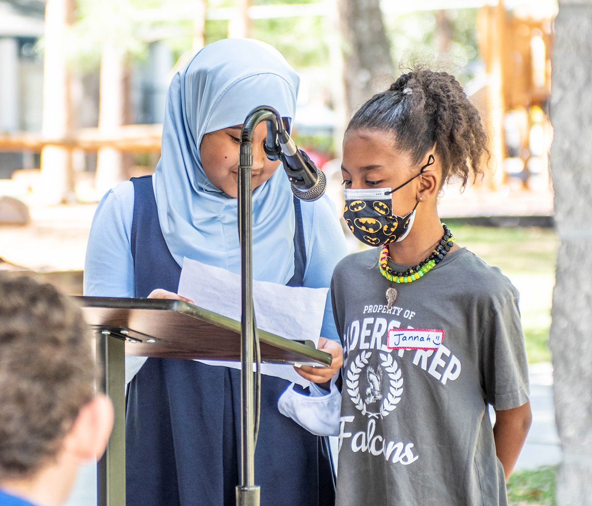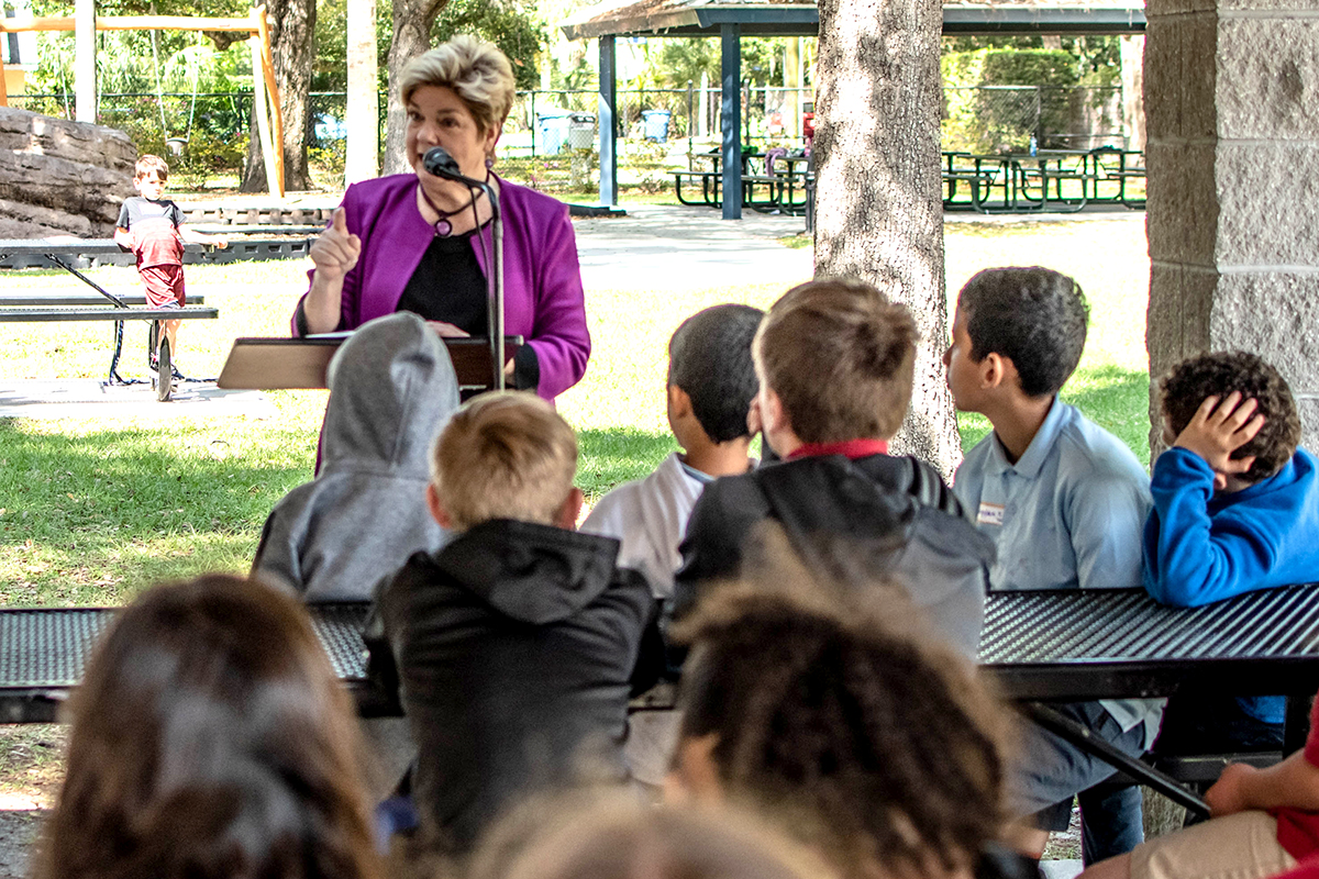 Vice Mayor Carolyn Cooper speaks to the students before the tree planting begins.