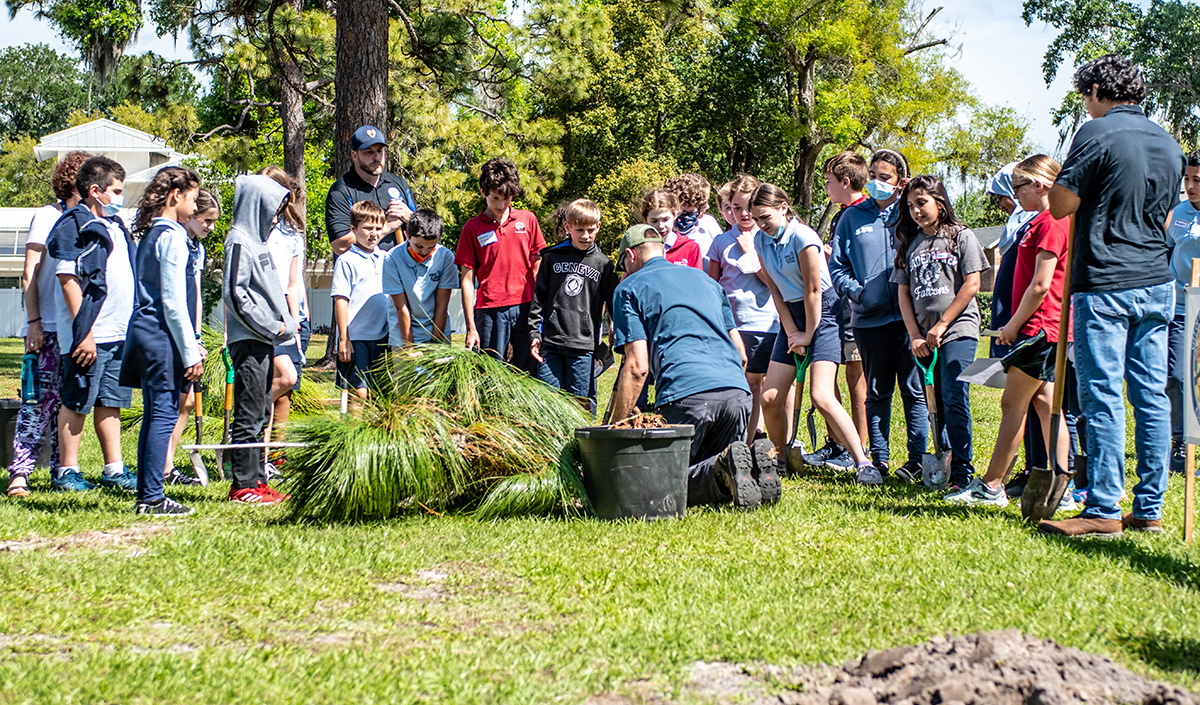 Students watch as The City of Winter Park’s Urban Forestry Division demonstrates the proper planting technique.