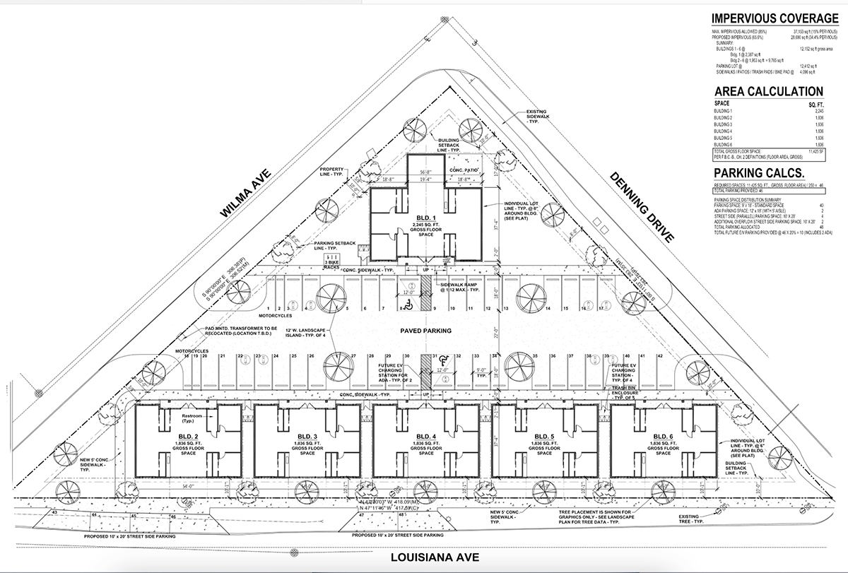 According to the meeting agenda item, five buildings, each measuring approximately 1,836 square feet, will be constructed along the Louisiana Avenue side of the property. The sixth building, measuring 2,245 square feet, will be at the corner of Wilma Avenue and North Denning Drive.