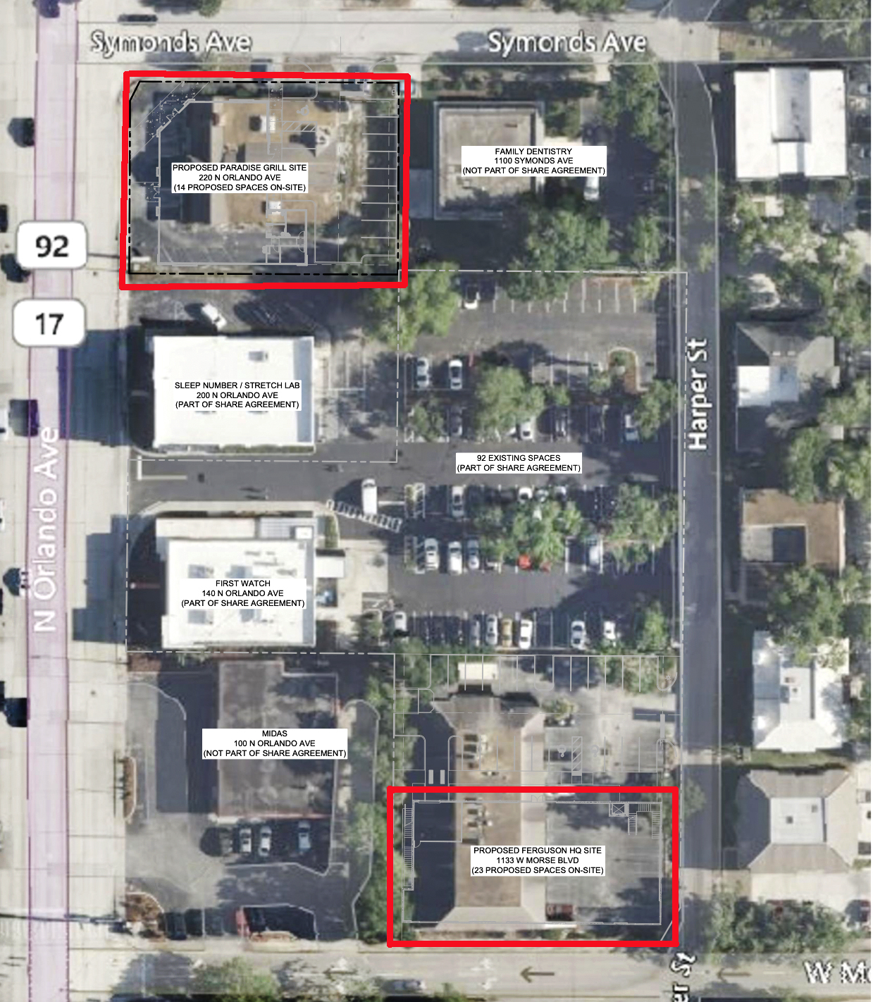 The 1133 W. Morse Blvd. parcel was legally combined with the neighboring First Watch property, at 140 N. Orlando Avenue, to accommodate the necessary floor area ratio and parking availability. The length of the building would also span the property’s Morse Boulevard frontage, which raised some concerns regarding sight line issues at the intersection of Morse Boulevard and the Harper Street access road.